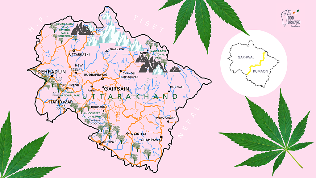 Map of Uttarakhand state showing the division of Garhwal and Kumaon regions. Graphic and sketch: Food Forward India